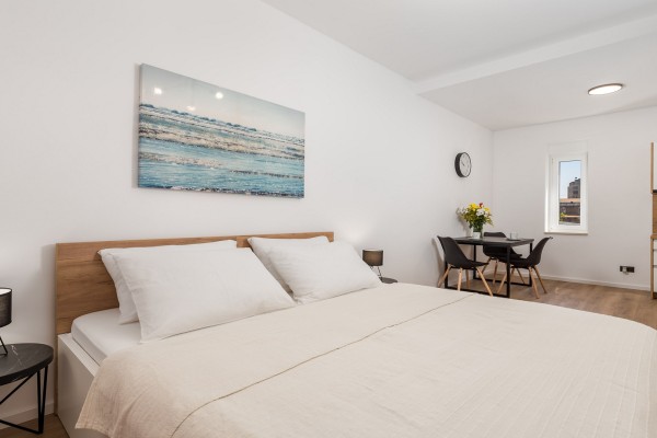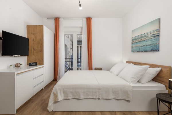 Studio apartman Harbour View 4 smješten je na trećem katu stambene zgrade u Trpimirovoj ulici 6. Ovaj manji, ali moderno uređen studio s otvorenim tlocrtom nudi udobnu spavaću zonu, funkcionalnu kuhinju i blagovaonski kutak. Neutralne boje, obilje prirodnog svjetla i pažljivo odabrani detalji stvaraju ugodnu i opuštajuću atmosferu, savršenu za kraći ili duži boravak.
