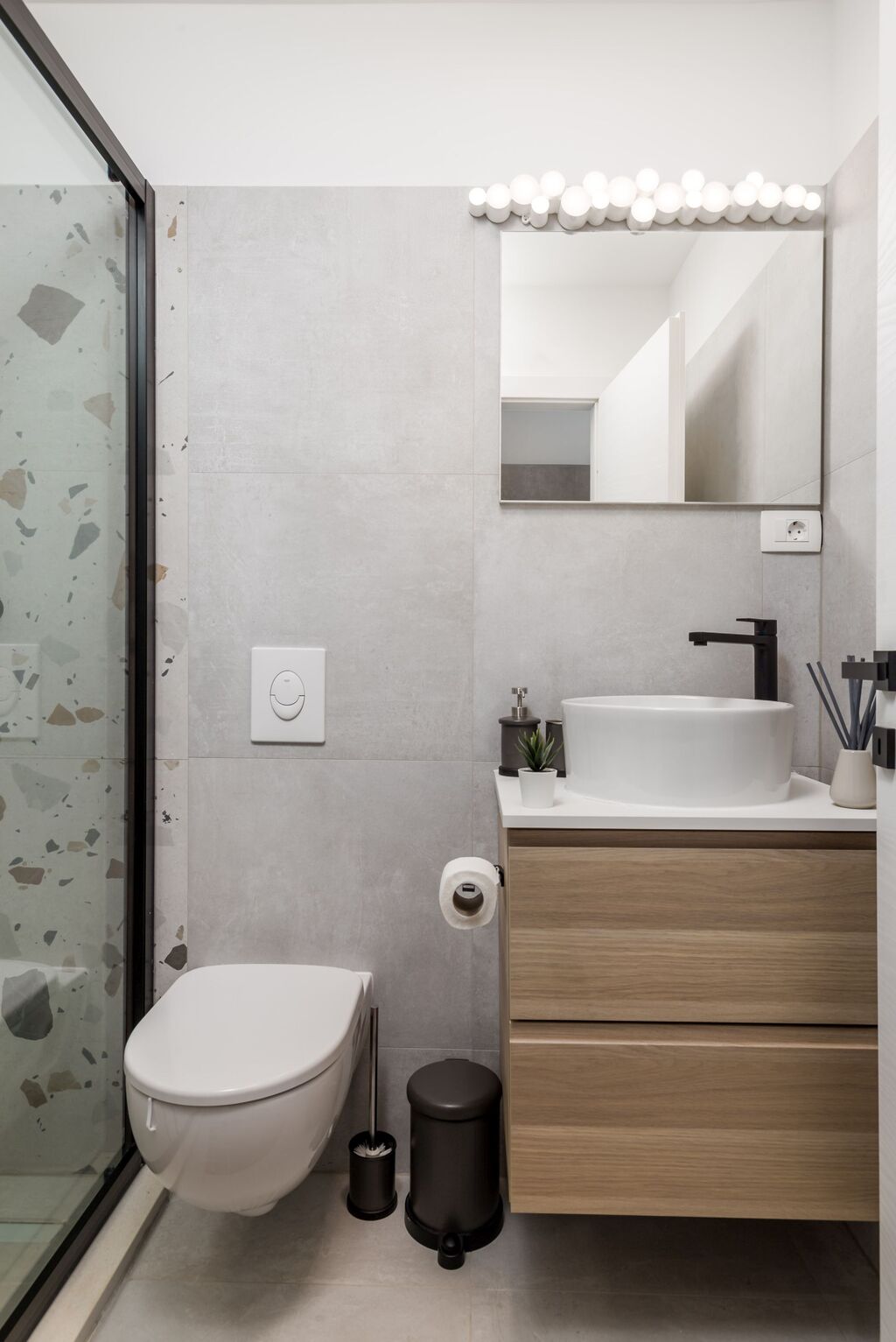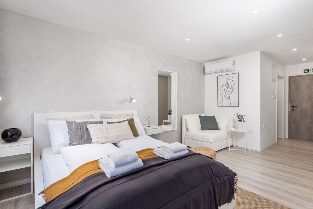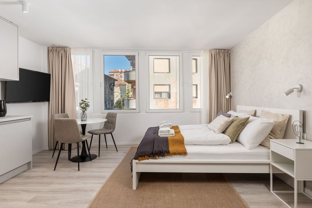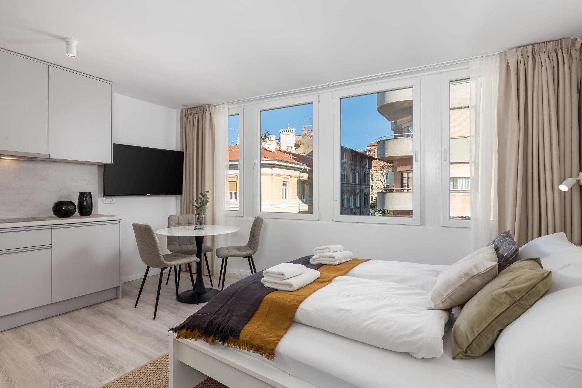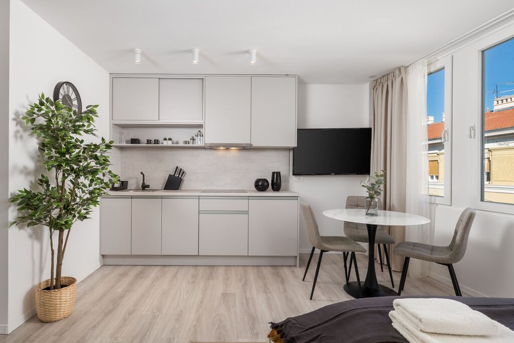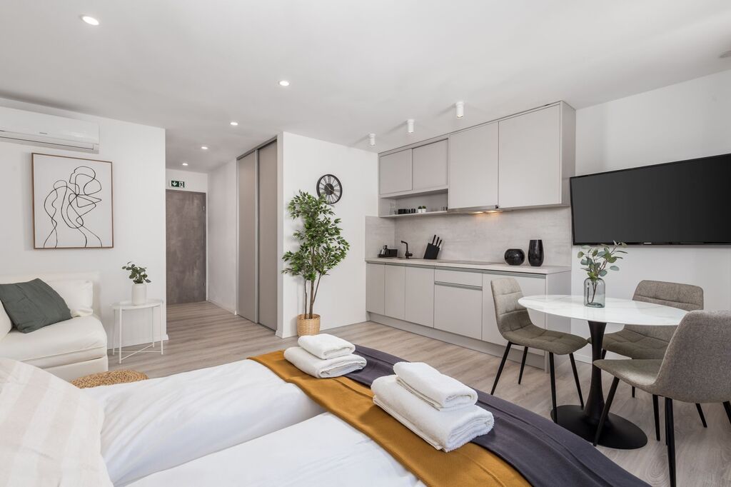Moderan i elegantan apartman idealan za ugodan boravak. Prostor je svijetao i prozračan, s minimalističkim dizajnom i pažljivo odabranim detaljima koji stvaraju opuštajuću atmosferu. Apartman sadrži udoban bračni krevet, prostrani ormar, blagovaonski stol sa stolicama te smart TV. Potpuno opremljena kuhinja omogućuje pripremu obroka, dok klima uređaj i besplatan Wi-Fi osiguravaju dodatnu udobnost. Savršen je za parove ili solo putnike koji traže moderan smještaj u ugodnom okruženju.