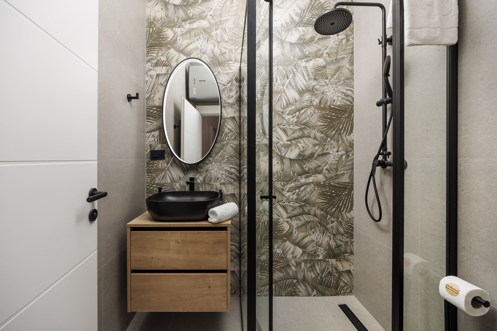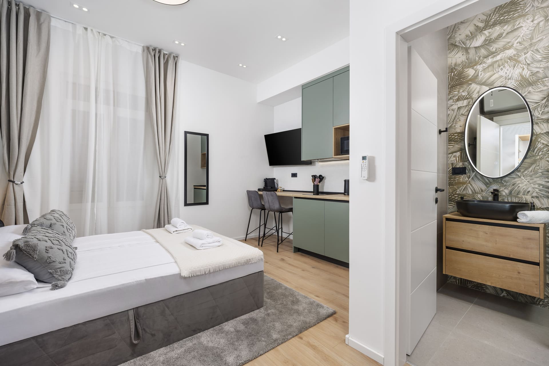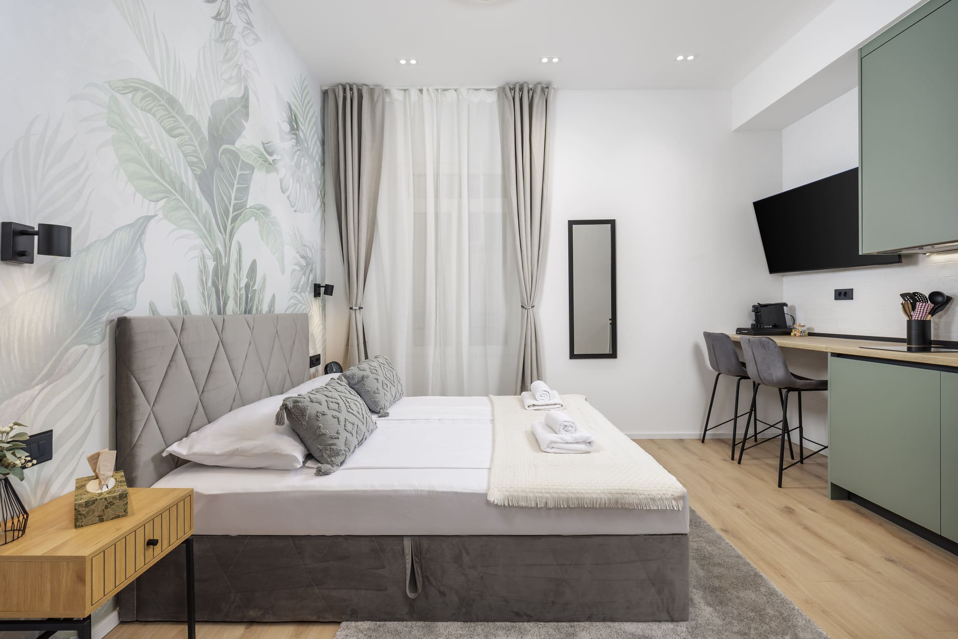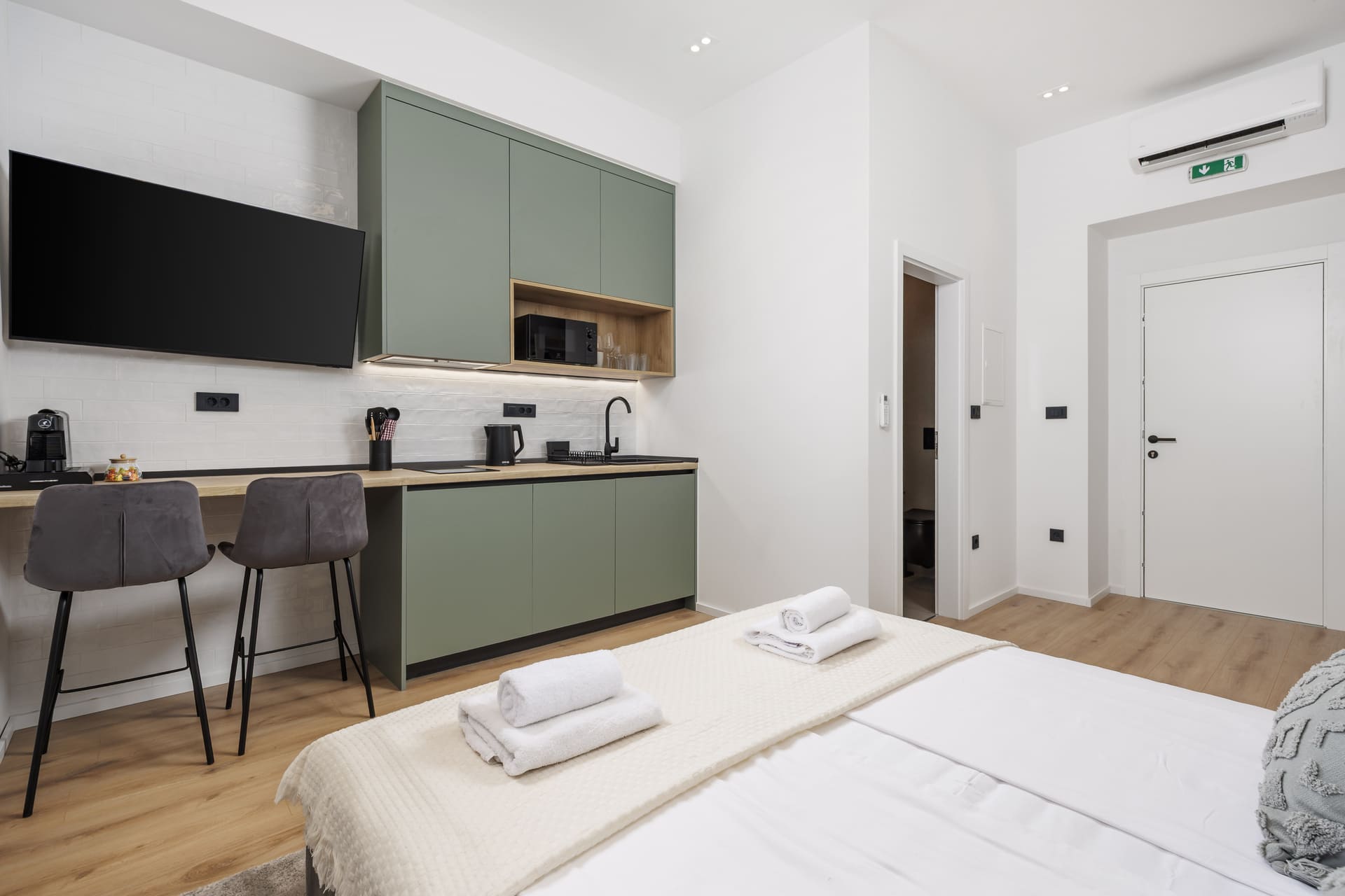 Das Apartment ist in beruhigenden Grüntönen gestaltet und schafft eine entspannende Atmosphäre. Der Raum ist sorgfältig organisiert, um die Fläche optimal zu nutzen und Komfort während des Aufenthalts zu bieten.